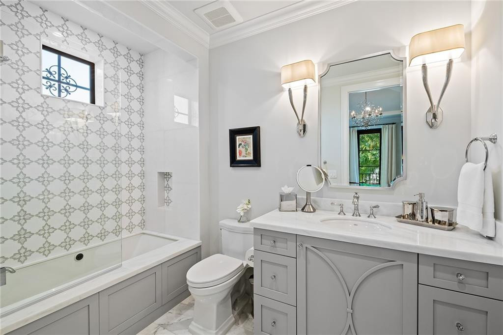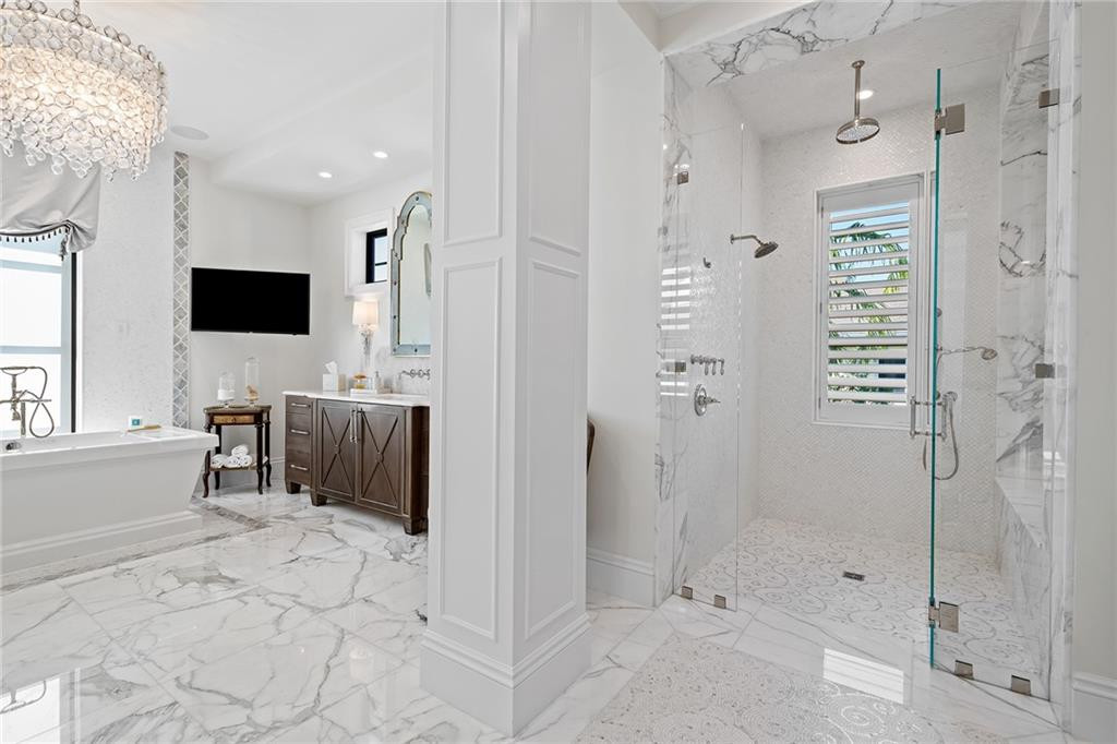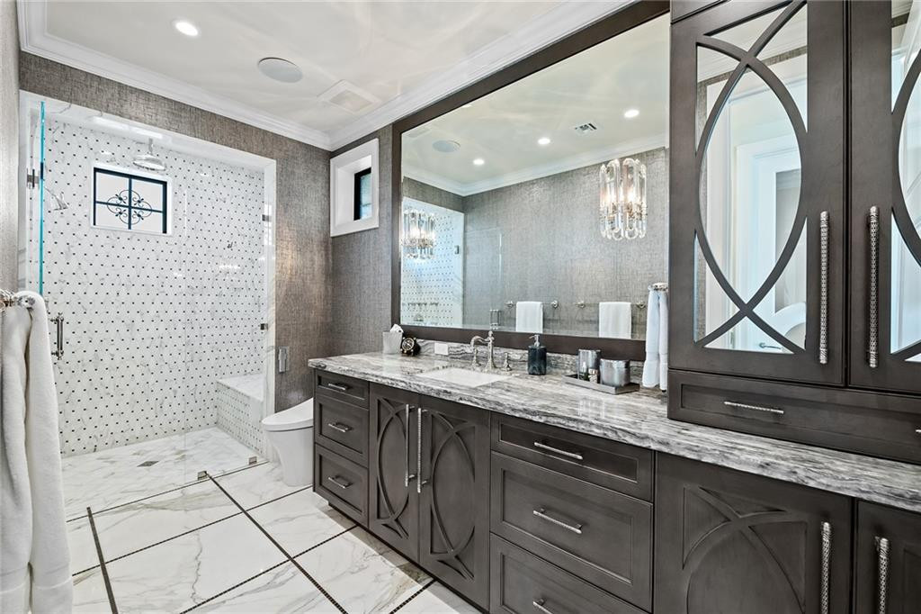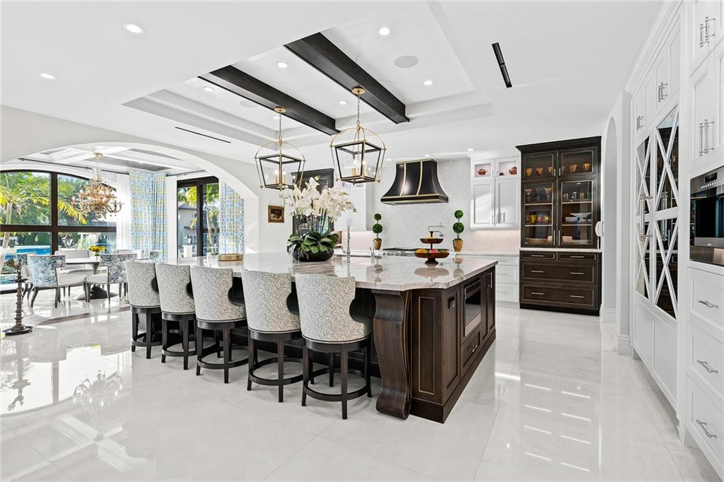 BESPOKE GRANDEUR!! 2020 CUSTOM!! 5 bedroom / 7.5 bath / 3 level residence. Well-conceived layout - epic two story foyer opens to living & formal dining rms, gorgeous gourmet kitchen w/spectacular island, breakfast rm, butler's pantry, laundry, cabana bath, office w/cylindrical aquarium, wet bar & VIP guest suite are on first level; Ascend grand staircase to enter primary suite w/waterfront views, dual spa-like baths, boutique sized closets, safe rooms & balcony; Also residing on this level are 3 ensuite guest rms, & 2nd laundry. Elevator & exterior staircase gain access to 3 level family fun media rm w/full bath & lux sun deck w/2nd summer kitchen! Resort-like salt pool/spa, 100' dock, 21K lift, summer kitchen, EV Charging; A/C Garages w/5 car availability, +golf cart bay, 100K Generator.